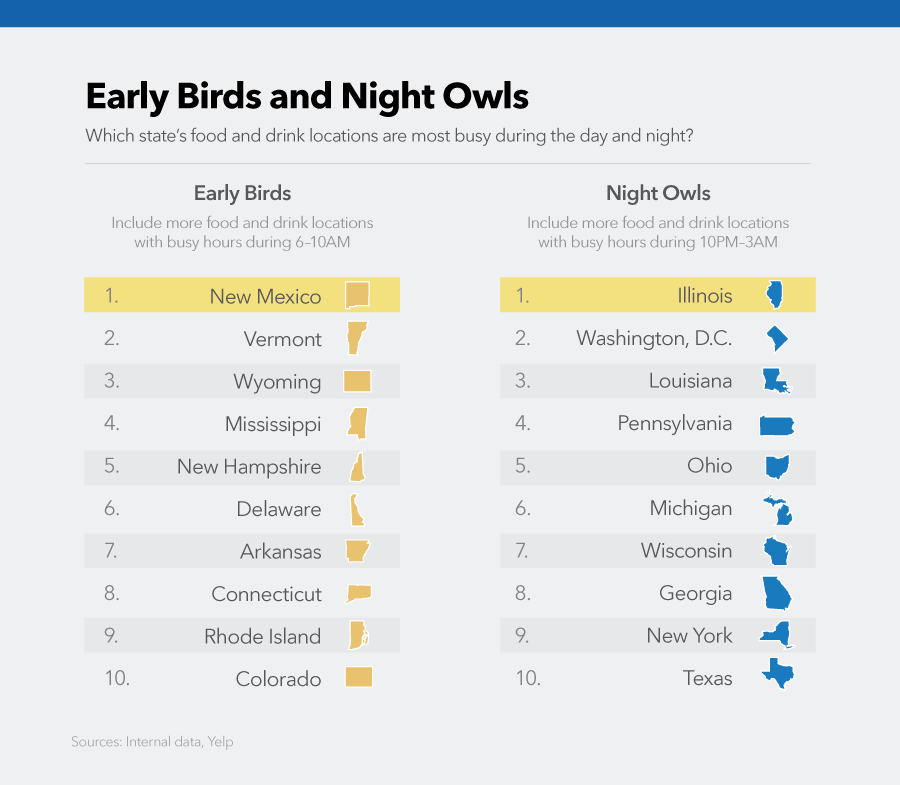If you think early to bed, early to rise is the way to go, you might find similar attitudes from people in states like New Mexico, Vermont, New Hampshire, and Wyoming. Among a few others, these areas were busiest between 6 a.m. and 10 a.m.
