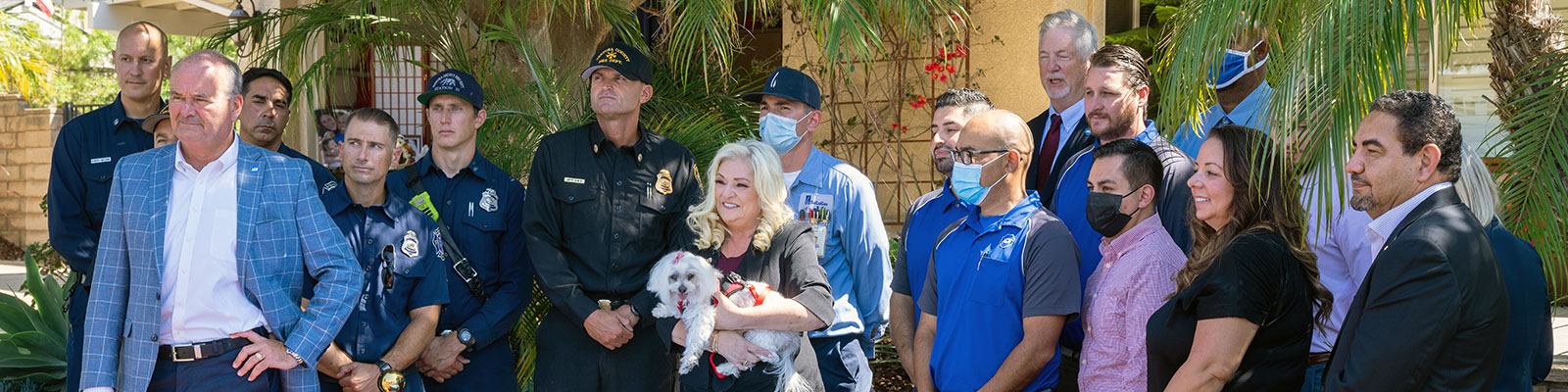 Thousand Oaks homeowner Pixie Monroe recently had her furniture cleaned not realizing that lethal levels of carbon monoxide were seeping into her home. The fumes were coming from the cleaning company's vehicle which was parked too close to her air conditioning unit. The deadly gas triggered multiple alarms and sent emergency signals to Florida where ADT Security Dispatcher Najee Freeman received them. He called Pixie and advised her to evacuate while he contacted local 911. When Ventura County firefighters arrived, they donned Personal Protection Equipment and used portable gas meters to confirm high levels of the 'silent killer.' A gas company technician identified the source and made sure it was safe for Pixie to re-enter. Pixie was relieved that she and her beloved Maltese, Bailey, were rescued. She was anxious to thank responders and greet Najee who flew 2,500 miles across America to meet her for the first time.