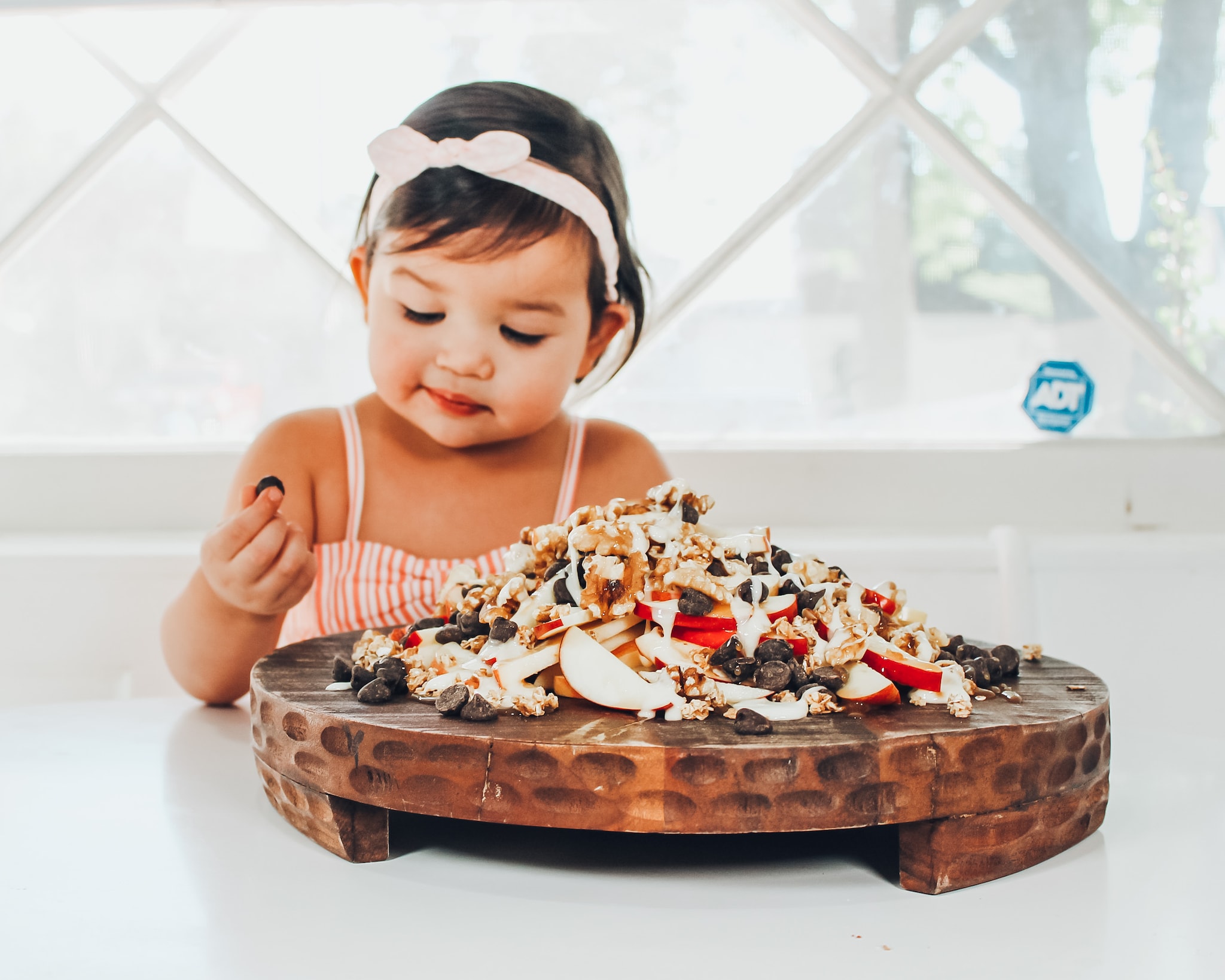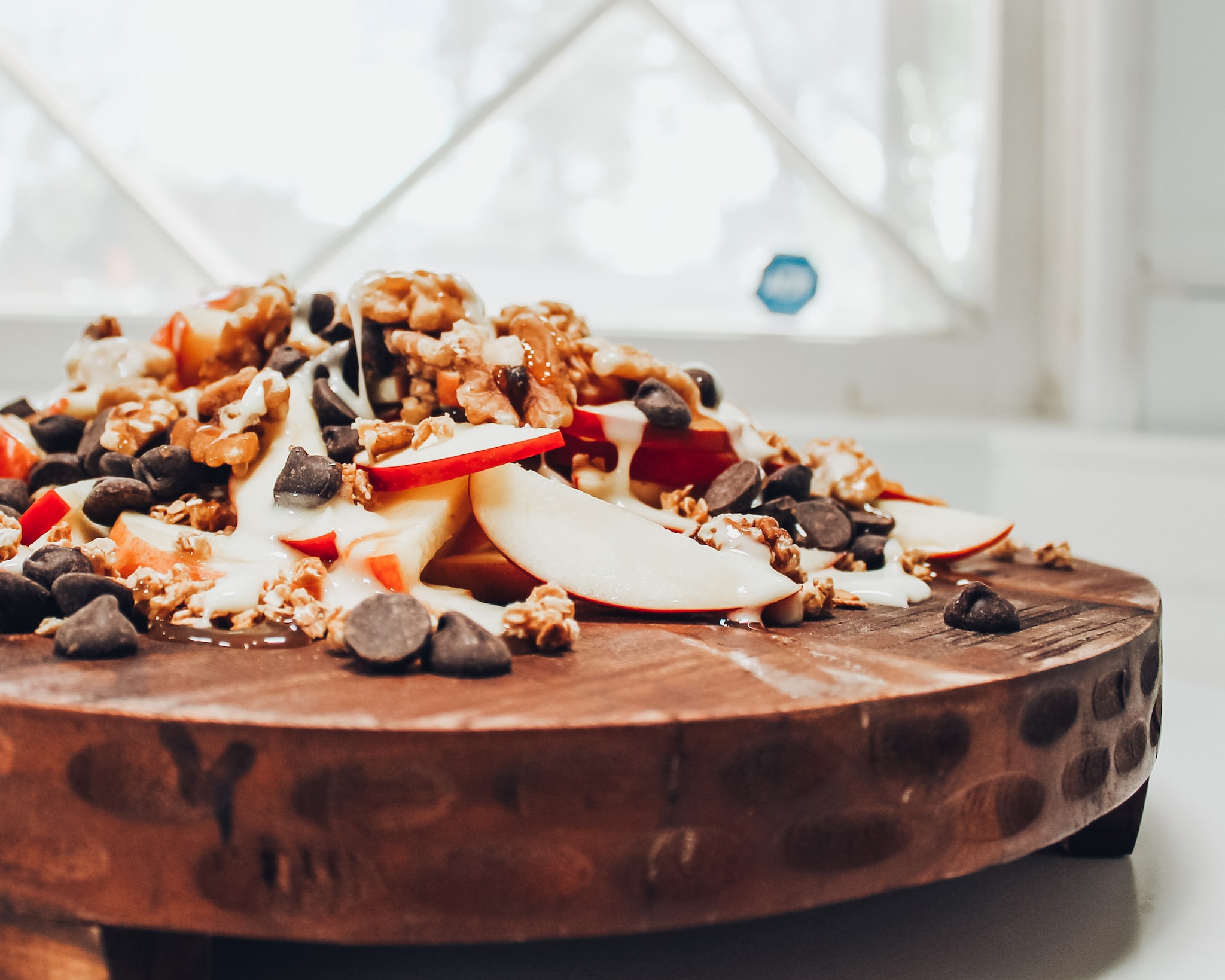 - Drizzle your sauces over the apple slices and top with chocolate chips, granola and nuts.