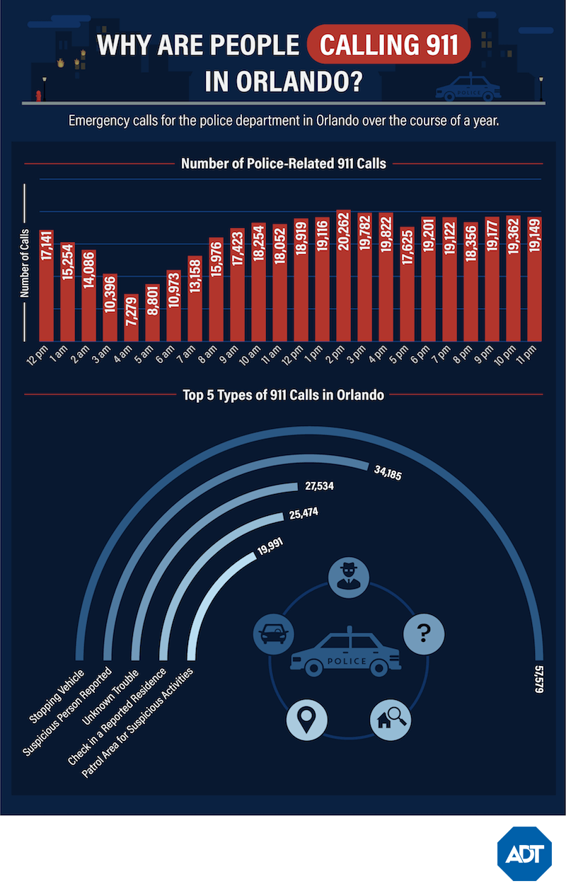 As with some of our other cities, afternoons in Orlando show the highest call volume on 911 lines. And the top crimes or emergencies being reported? Again, traffic issues lead the way, but this time other common issues include suspicious persons, unknown trouble, and house or business checks.