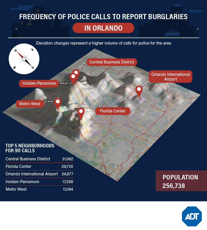 According to our data, the areas with higher burglary risk are mostly concentrated in northern Orlando. According to Neighborhood Scout, the safest neighborhoods overall include Bay Hill and Lake Hart. Annual property crimes top out just under 17,000 – a scary number for any homeowner.