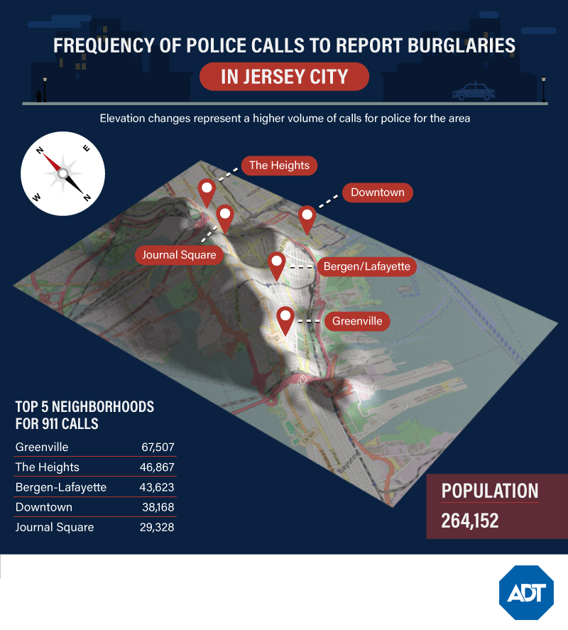 Perhaps the number of suspicious-person calls reflects the danger of break-ins in Jersey City. Property crimes total 4,229 annually and, as you can see from the map above, the highest risk areas run in a ridge pattern right through the center of town.