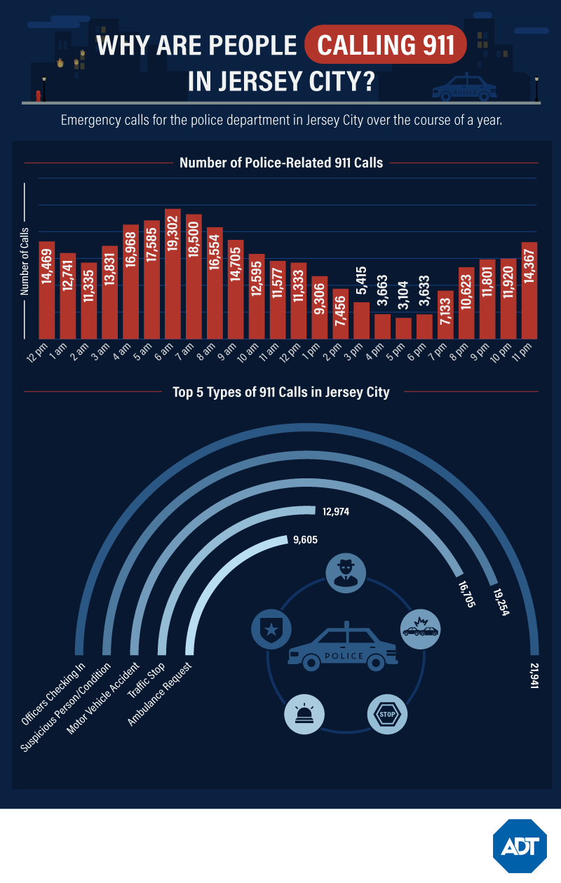 Like our other cities, Jersey City sees a spike in 911 activity in the early morning, culminating at 6 a.m. with the highest call volume. What’s unique about their call data is that unlike the other cities we reviewed, Jersey City Police are required to call in to dispatch when they are eating on the job - hence “officers checking in” are their number one category of call in. The most common nerve-wracking call is to report a suspicious person or situation (more than 11,000 calls), followed closely by calls about car accidents.