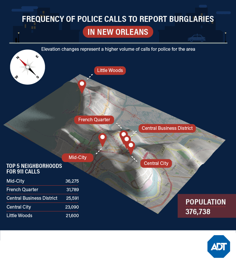 So, where are those silent burglar alarms going off? They’re scattered throughout town, as our map shows. This could be part of the reason that New Orleans is considered to be among the least safe cities in the U.S. (bottom 6 percent), and has nearly four times as many property crimes as Jersey City.