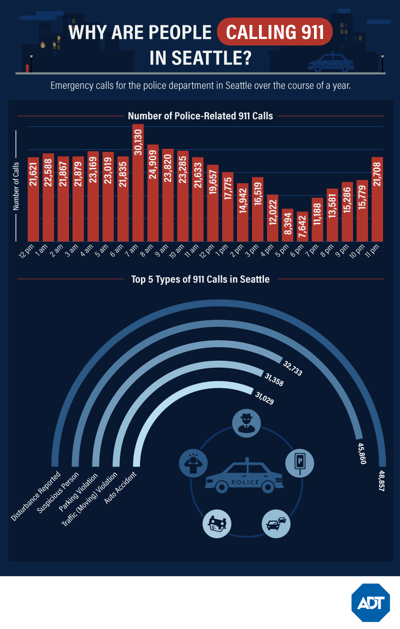 In Seattle, the most police-related 911 calls are made between the hours of 7 a.m. and 8 a.m. It’s impossible to determine why so many occur during this time period but it does make Seattle unique as this is a peak time different from every other city in this study. If the number of calls to police in 2016 regarding suspicious persons and disturbances seems high for a city with a population of around 650,000 you are indeed correct. Seattle has seen a rise in property crimes over the past year, though their rates of violent crimes continue to be lower than average.